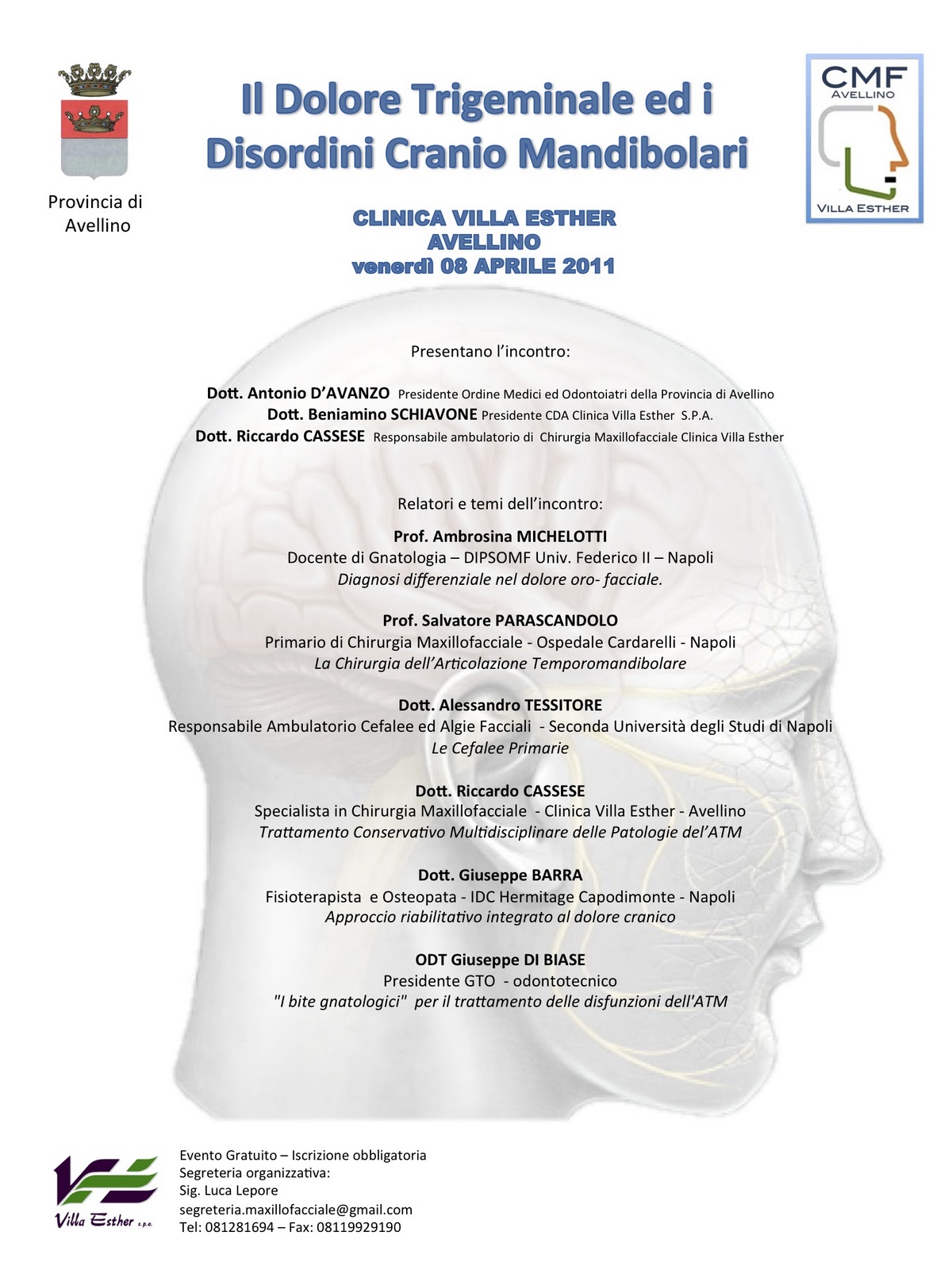 Tra i relatori la Prof.ssa Ambrosina Michelotti, docente di gnatologia presso l'Università Federico II e presidente dell' European Academy of Craniomandibular Disorders, il Prof. Salvatore Parascandolo, primario di Chirurgia Maxillofacciale presso l'AORN Cardarelli di Napoli, il Dott. Alessandro Tessitore, neurologo e responsabile dell'ambulatorio cefalee presso la Seconda Università degli Studi di Napoli, il dott. Giuseppe Barra, fisioterapista presso l'IDC Hermitage di Napoli, e Giuseppe di Biase, ODT e presidente dell'Associazione Nazionale Tecnici di Ortodonzia. Il convegno si rivolge ai medici, ai medici di base, agli odontoiatri, ai fisioterapisti e tutti coloro che spesso si misurano con il dolore cranico, sia esso di natura trigeminale primitivo o secondario ad altre patologie quali le disfunzioni dell'articolazione mandibolare.
